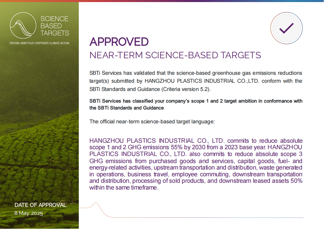 2025年05月10日,FH体育(中国)官方网站(以下简称“杭塑”)正式宣布,公司提交的截止到2030年减碳目标已通过国际权威机构“科学碳目标倡议”(Science Based Targets initiative, SBTi)的全面审核认证。此举标志着杭塑的碳中和路径与国际温控1.5℃目标进一步对齐,为行业绿色转型树立科学实践标杆。